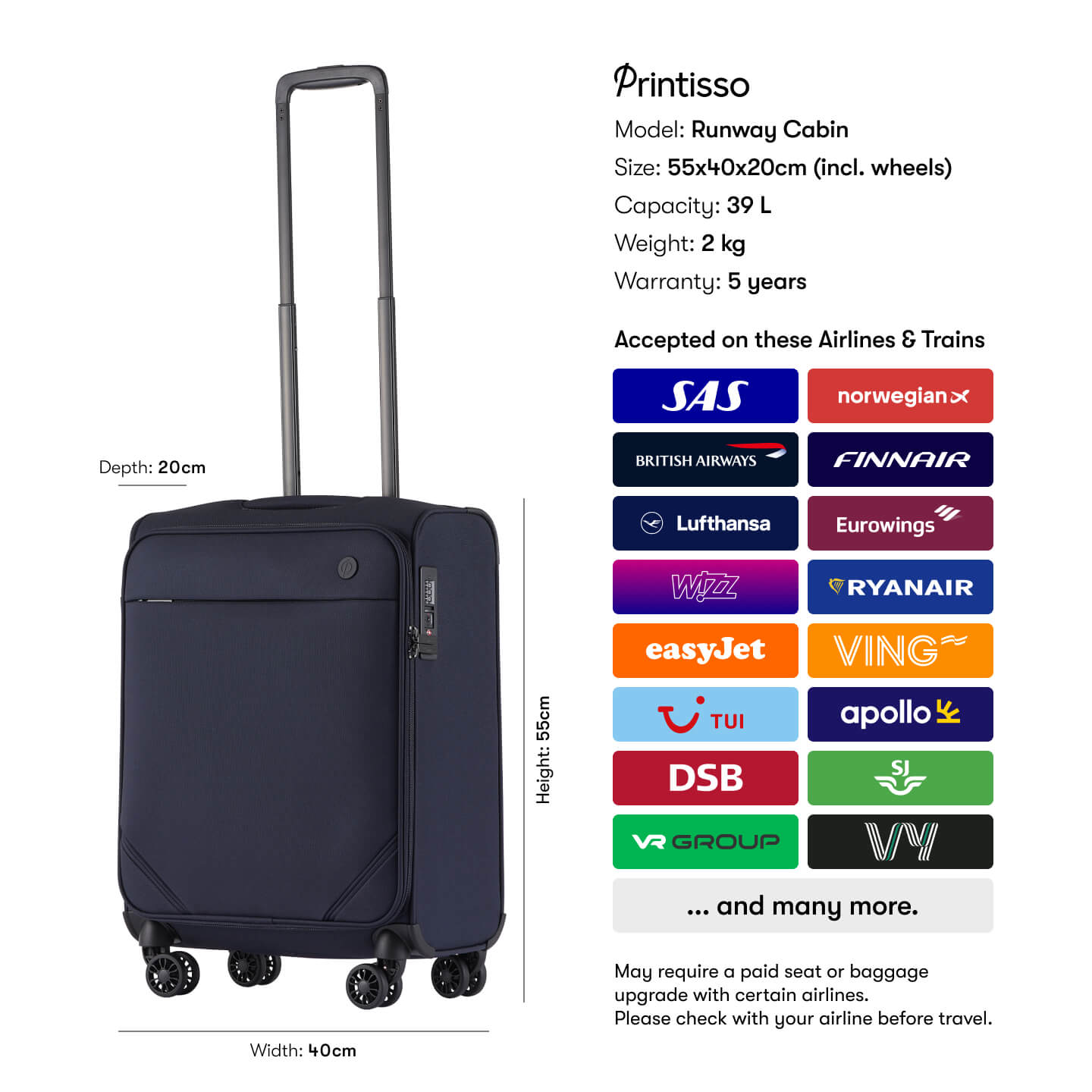 Printisso Runway -käsimatkalaukku on suunniteltu sinulle, joka etsit kevyttä, kestävää ja älykästä käsimatkatavaraa. Siinä on kätevä etutasku, johon mahtuu jopa 14 tuuman tietokone, sekä sivutasku passille, puhelimelle, avaimille ja muille henkilökohtaisille tavaroille. Valmistettu kestävästä ja vettä hylkivästä materiaalista, Runway takaa pitkän käyttöiän ja siihen sisältyy 5 vuoden kattava takuu. Sen huomaamaton muotoilu, jossa on vahvistetut linjat alakulmissa, tekee laukun tunnistamisesta helppoa matkatavarahihnalla. Runway-sarjaa on saatavana neljässä suositussa värissä, ja se on täydellinen lyhyelle viikonloppumatkalle tai 1-4 päivän liikematkalle. Laukun mitat on suunniteltu täyttämään kaikkien lentoyhtiöiden vaatimukset, ja se sopii myös erinomaisesti juna- ja automatkoille.